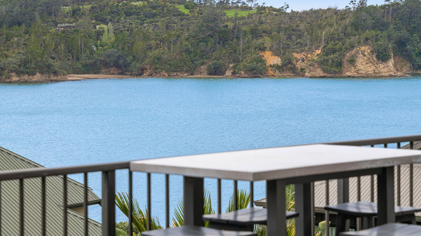 Open kitchen, dining and living flowing to a large entertainers deck overlooking that view